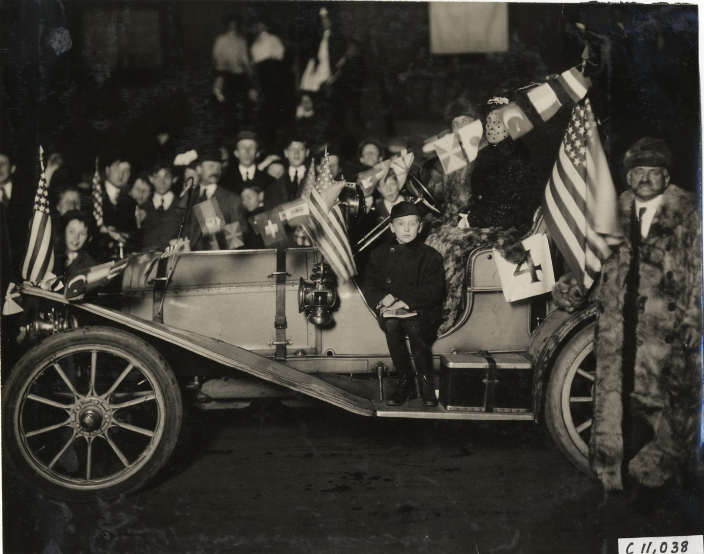 Nighttime view of Oldsmobile car decorated with flags for 1908 automobile carnival in New York City. Boy poses on running board of car; man wearing fur coat and hat stands on right. Handwritten on back: "Parades--Automobile Carnival, 1908. Oldsmobile."