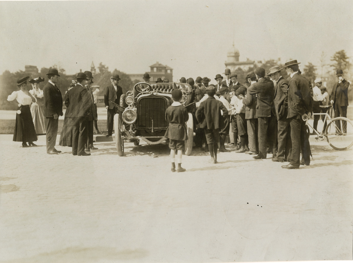 Crowd gathering around automobile, 1906 Long Island Automobile Club parade