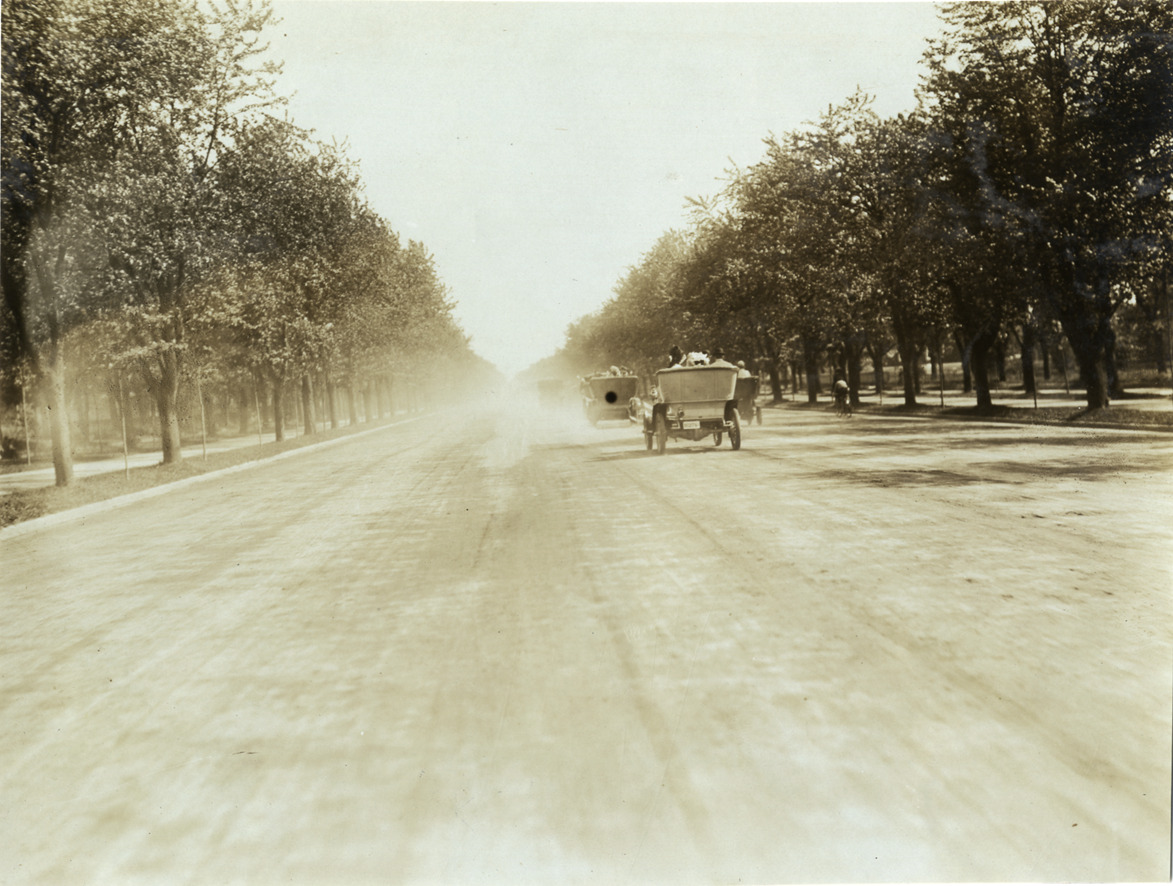 Automobiles traveling on tree-lined street, 1906 Long Island Automobile Club parade