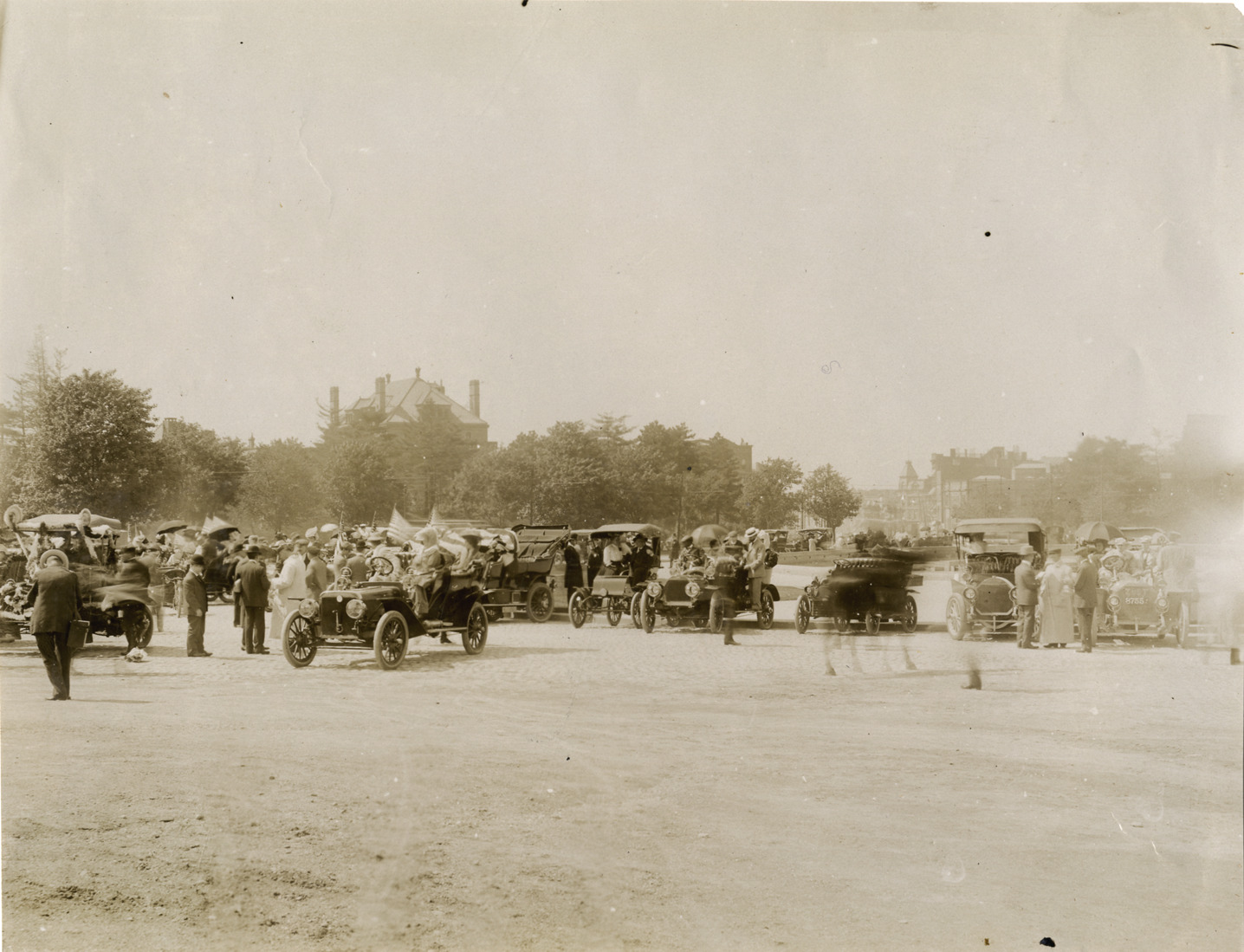 View of motorists with cars at 1906 Long Island Automobile Club parade in Brooklyn. Stamped on back: "Photo by F. Ed. Spooner, 1536 B'way, telephone 6536-38th St., New York, N.Y." Handwritten on back: "Parades--Long Island Automobile Club parade, 1906."