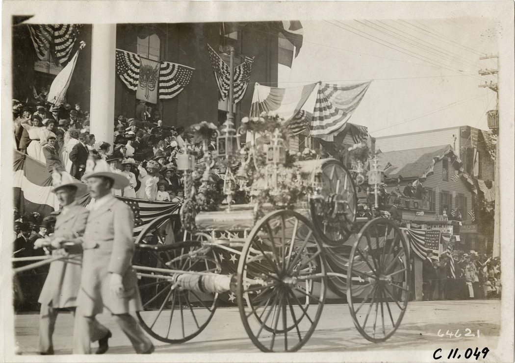 View of two firemen pulling steam pumper at 1910 parade in New Rochelle, New York. Spectators in grandstand in background; grandstand and buildings are decorated with American flags and bunting. Stamped on back: "Spooner & Wells, Inc., photographers, telephones 3472-3473 Columbus, 1931 Broadway, New York." Handwritten on back: "Parades--New Rochelle parade, 1910."