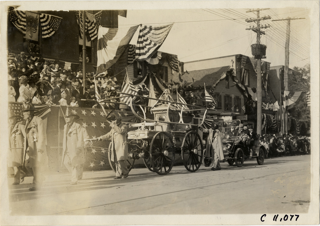 View of firemen pulling steam pumper at 1910 parade in New Rochelle, New York, followed by automobile. Spectators in grandstand in background; grandstand and buildings are decorated with American flags and bunting. Stamped on back: "Spooner & Wells, Inc., photographers, telephones 3472-3473 Columbus, 1931 Broadway, New York." Handwritten on back: "Parades--New Rochelle parade, 1910."