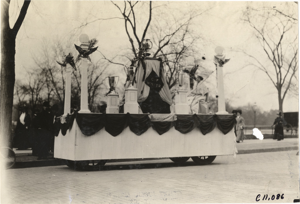 View of parade float displaying awards won by the Matheson Motor Car Company at 1909 New York automobile carnival parade. Trophy cups are displayed on pedestals; woman holding flag sits at end of float. Stamped on back: "Spooner & Wells, Inc., photographers, telephones 3472-3473 Columbus, 1931 Broadway, New York." Handwritten on back: "Parades--New York automobile carnival, 1909. Matheson."