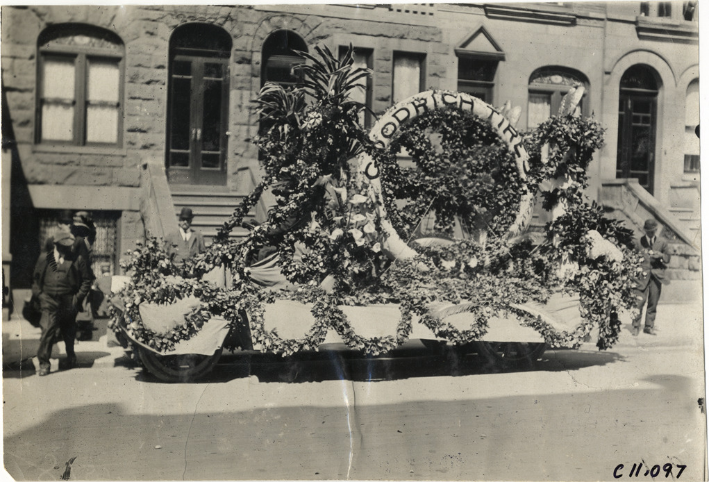 View of Goodrich tires float at 1909 New York automobile carnival parade. Float is covered with floral decorations and large tire printed with "Goodrich tires." Stamped on back: "Spooner & Wells, Inc., photographers, telephones 3472-3473 Columbus, 1931 Broadway, New York." Handwritten on back: "Parades--New York automobile carnival, 1909."