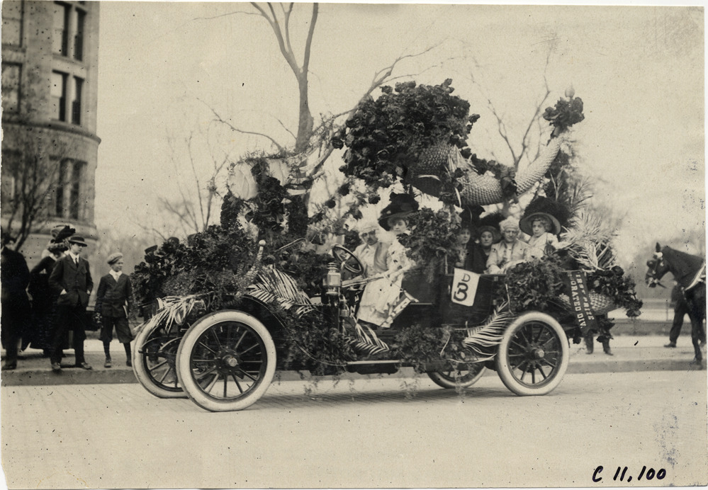 View of costumed men and women in Lozier car decorated with flowers, palms and cornucopias during 1909 New York automobile carnival parade. "D3" sign and "First prize, Decorated Div." flag displayed on car. Stamped on back: "Spooner & Wells, Inc., photographers, telephones 3472-3473 Columbus, 1931 Broadway, New York." Handwritten on back: "Parades--New York automobile carnival, 1909. Lozier."