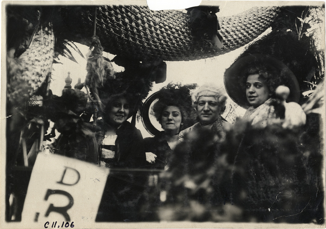 Close-up view of costumed men and women posing in Lozier car decorated with flowers, palms and cornucopias during 1909 New York automobile carnival parade. Stamped on back: "Spooner & Wells, Inc., photographers, telephones 3472-3473 Columbus, 1931 Broadway, New York." Handwritten on back: "Parades--New York automobile carnival, 1909."