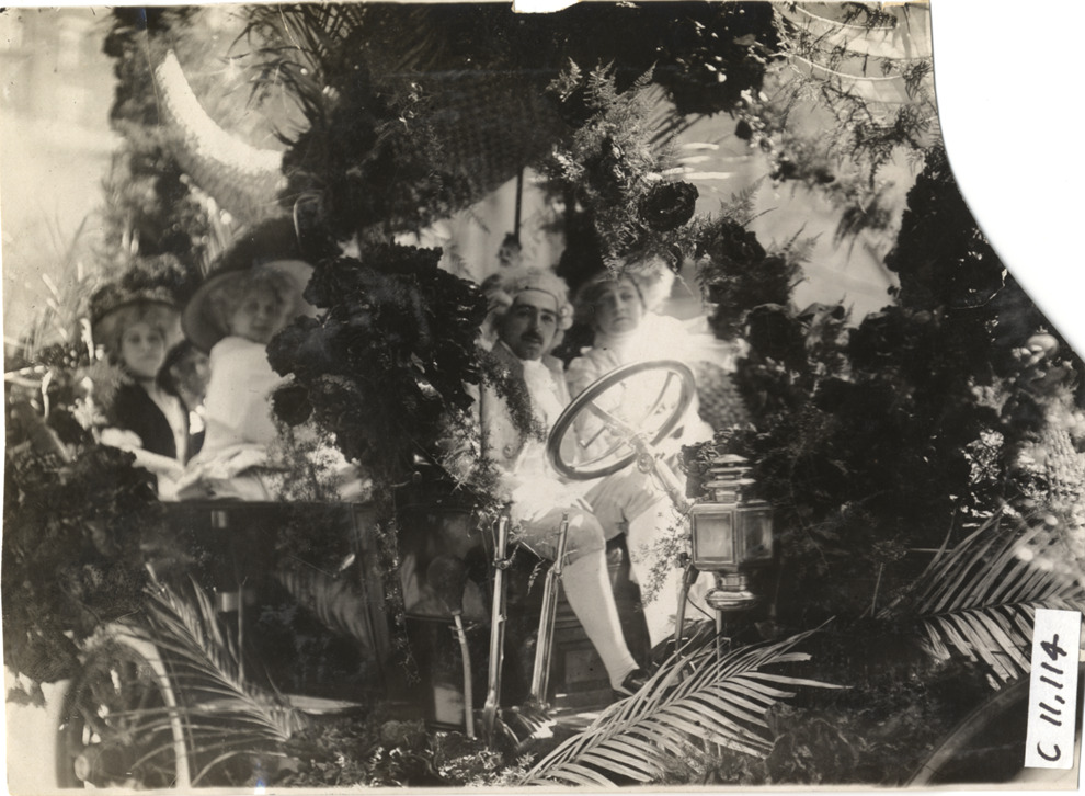 Close-up view of costumed men and women posing in Lozier car decorated with flowers, palms and cornucopias during 1909 New York automobile carnival parade. Stamped on back: "Spooner & Wells, Inc., photographers, telephones 3472-3473 Columbus, 1931 Broadway, New York." Handwritten on back: "Parades--New York automobile carnival, 1909."