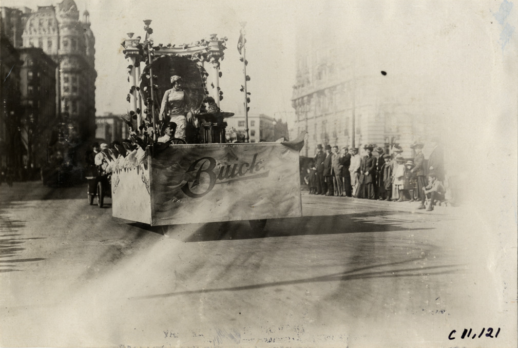 Annette Kellerman riding on Buick float, 1909 New York automobile carnival