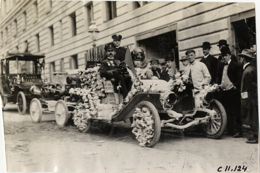 View of Buick automobile featuring Captain Louis Sorcho's great deep sea divers at 1909 New York automobile carnival parade. Car is covered with floral decorations; "Buick" pennants displayed on car. Man in passenger seat wears diving costume. Stamped on back: "Spooner & Wells, Inc., photographers, telephones 3472-3473 Columbus, 1931 Broadway, New York." Handwritten on back: "Parades--New York automobile carnival, 1909."