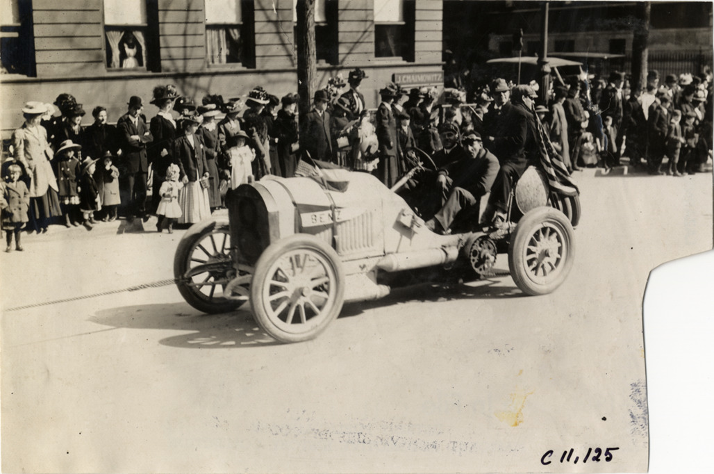 View of David Bruce-Brown and three men in Benz racecar during 1909 New York automobile carnival parade. Spectators watch from sidewalk. Stamped on back: "Spooner & Wells, Inc., photographers, telephones 3472-3473 Columbus, 1931 Broadway, New York." Handwritten on back: "Parades--New York automobile carnival, 1909. Bruce Brown, Benz."