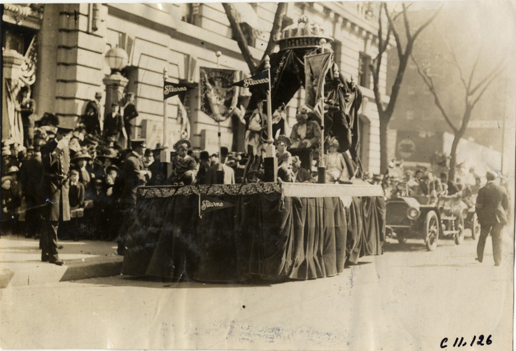 View of Guy Vaughan, King of the 1909 New York automobile carnival, riding on Stearns float during parade. Vaughan sits on throne under canopy; children in costume sit on float. "Stearns" flags and "Carnival" banner displayed on float. Stamped on back: "Spooner & Wells, Inc., photographers, telephones 3472-3473 Columbus, 1931 Broadway, New York." Handwritten on back: "Parades--New York automobile carnival, 1909. Stearns."