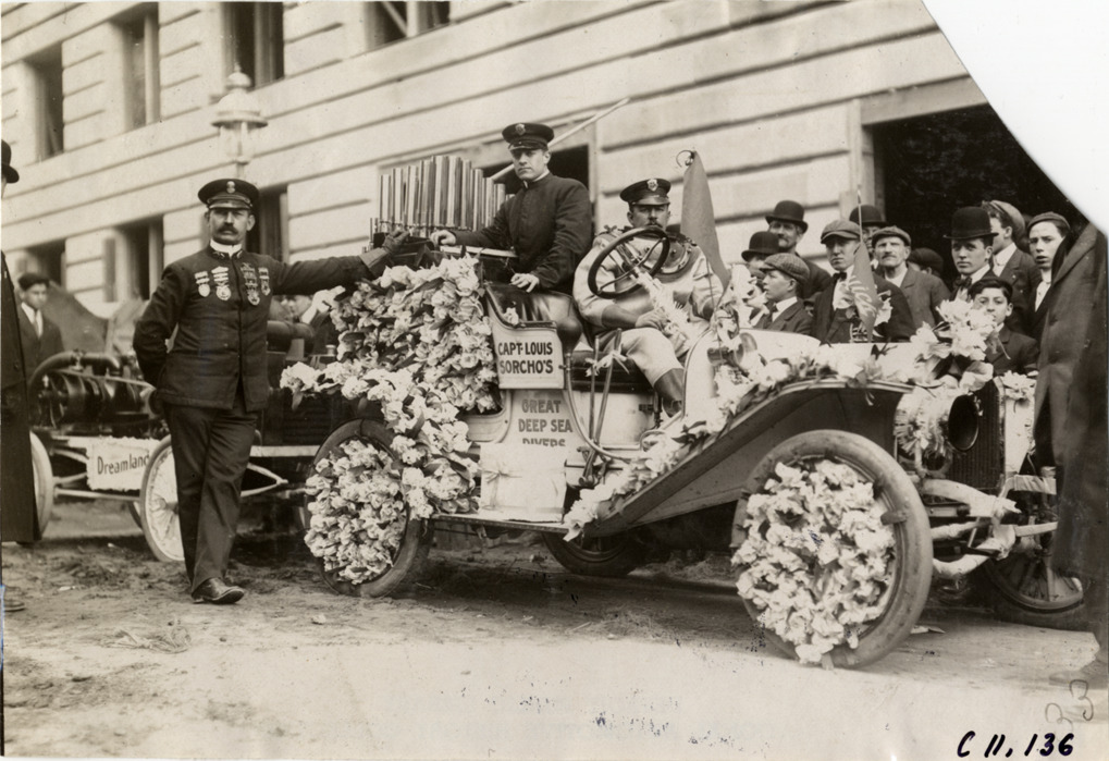 Buick automobile featuring Captain Louis Sorcho's deep sea divers, 1909 New York automobile carnival