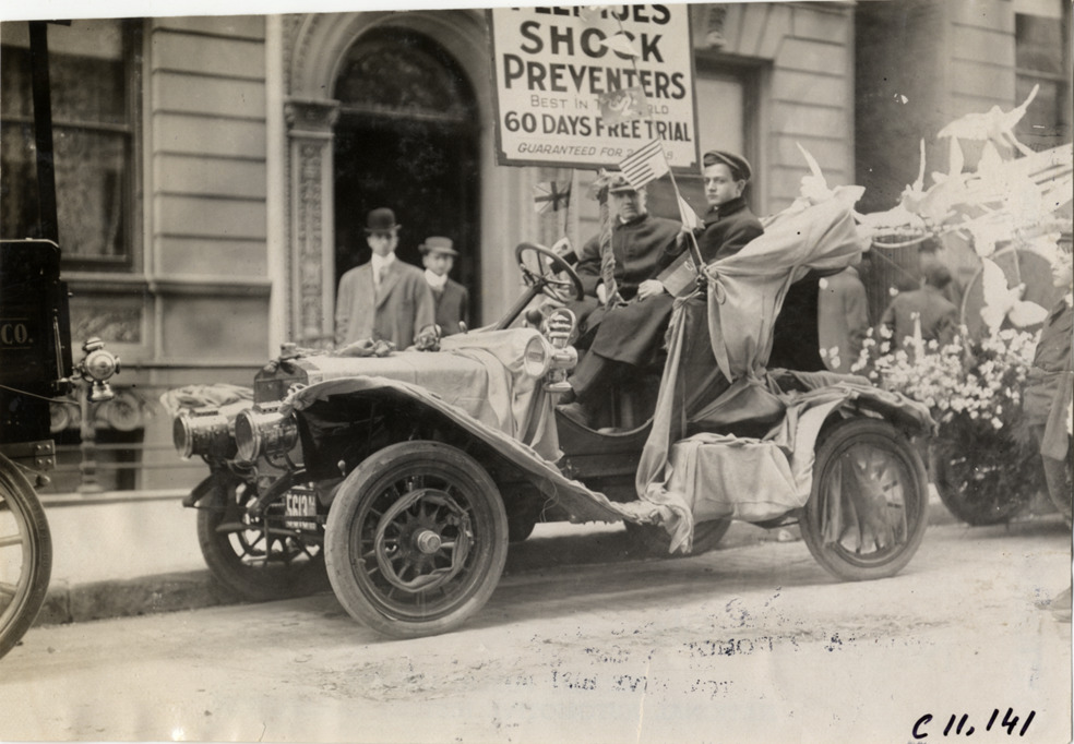 View of men in car holding sign that advertises shock preventers during 1909 New York automobile carnival parade. Car is decorated with flags and draped fabric. Stamped on back: "Spooner & Wells, Inc., photographers, telephones 3472-3473 Columbus, 1931 Broadway, New York." Handwritten on back: "Parades--New York automobile carnival, 1909."
