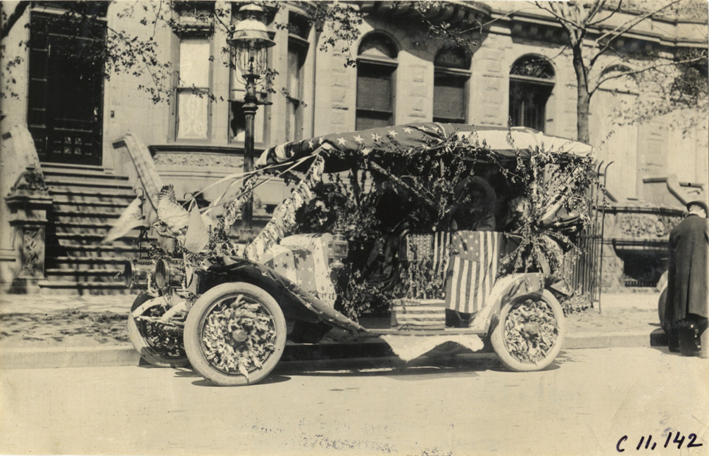 View of Lozier car decorated with flowers, flags and ribbons during 1909 New York automobile carnival parade. Stamped on back: "Spooner & Wells, Inc., photographers, telephones 3472-3473 Columbus, 1931 Broadway, New York." Handwritten on back: "Parades--New York automobile carnival, 1909. Lozier."