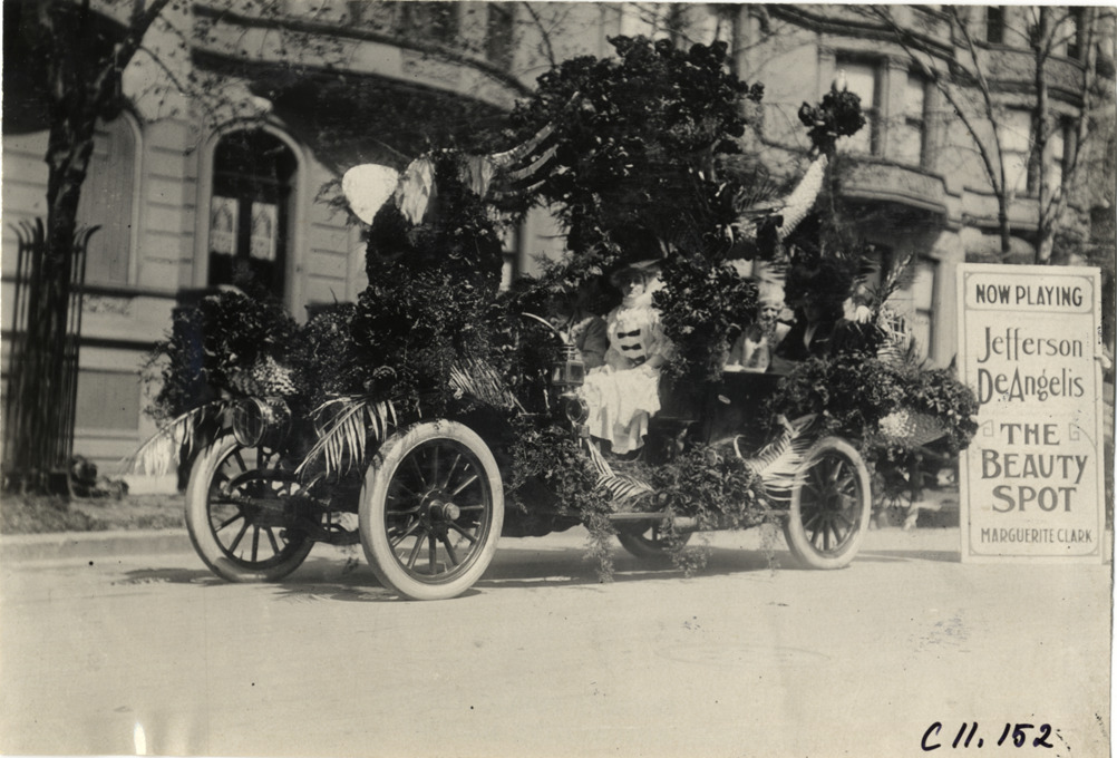 View of costumed men and women in Lozier car decorated with flowers, palms and cornucopias during 1909 New York automobile carnival parade. Sign next to car reads: "Now playing, Jefferson DeAngelis, 'The Beauty Spot,' Marguerite Clark." Stamped on back: "Spooner & Wells, Inc., photographers, telephones 3472-3473 Columbus, 1931 Broadway, New York." Handwritten on back: "Parades--New York automobile carnival, 1909."