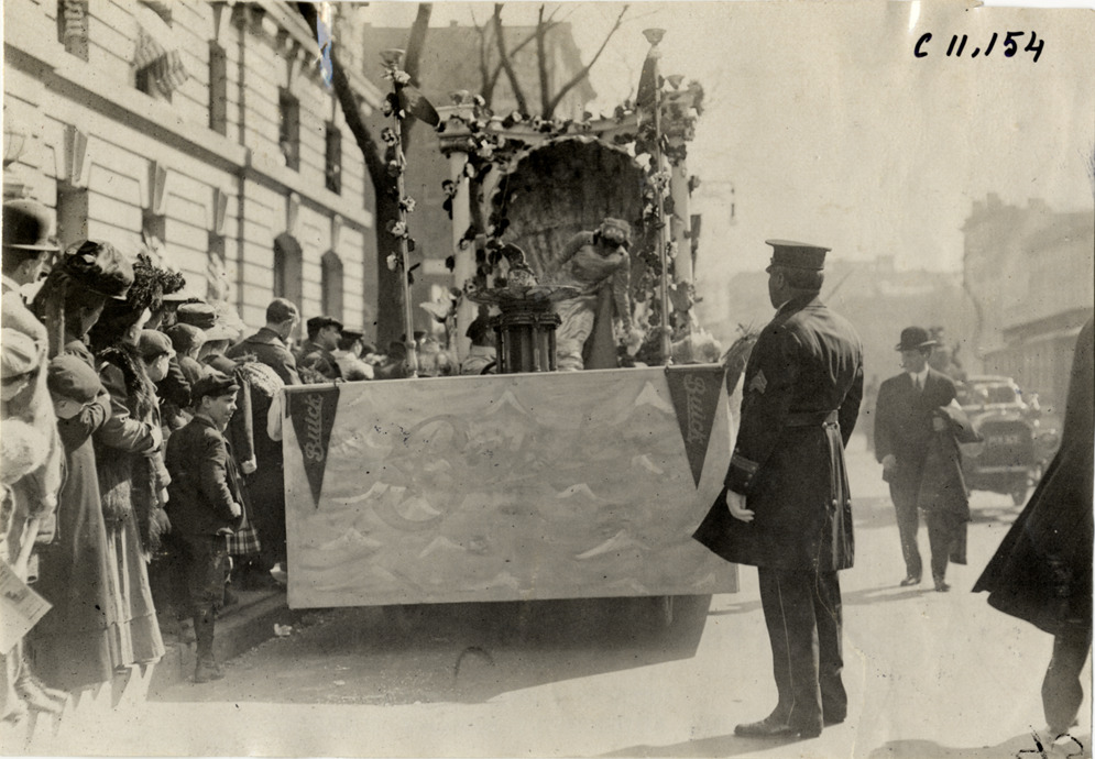 View of Annette Kellerman, Queen of the 1909 New York automobile carnival, riding on Buick float during parade. Kellerman sits in seashell throne; "Buick" and waves painted on front and sides of float. Spectators watch from sidewalk. Stamped on back: "Spooner & Wells, Inc., photographers, telephones 3472-3473 Columbus, 1931 Broadway, New York." Handwritten on back: "Parades--New York automobile carnival, 1909."