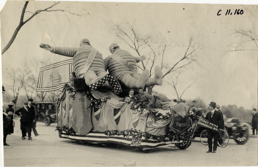 Michelin parade float featuring Michelin Twins, 1909 New York automobile carnival