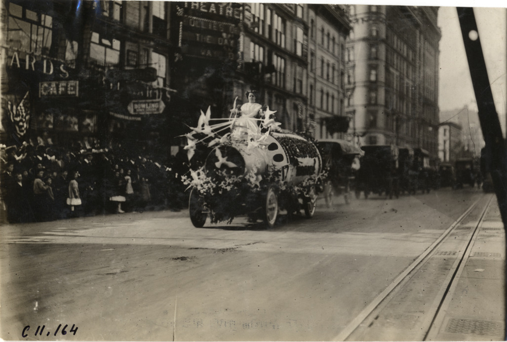 View of float resembling a Thermos bottle at 1909 New York automobile carnival parade. Float is decorated with flowers; woman sits atop float holding ribbons attached to doves. Stamped on back: "Spooner & Wells, Inc., photographers, telephones 3472-3473 Columbus, 1931 Broadway, New York." Handwritten on back: "Parades--New York automobile carnival, 1909."