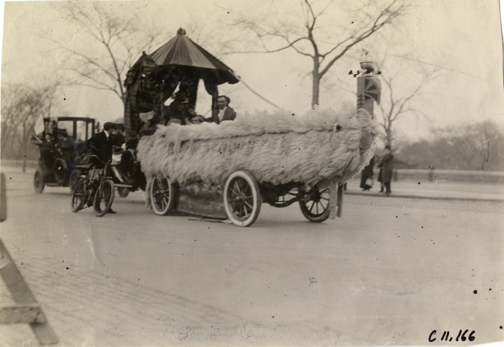 View of Oldsmobile parade float resembling a barge at 1909 New York automobile carnival parade. Stamped on back: "Spooner & Wells, Inc., photographers, telephones 3472-3473 Columbus, 1931 Broadway, New York." Handwritten on back: "Parades--New York automobile carnival, 1909."