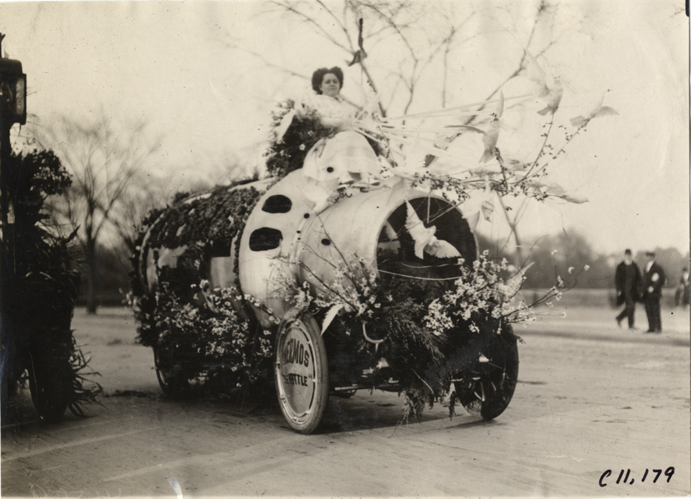 View of float resembling a Thermos bottle at 1909 New York automobile carnival parade. "Thermos" spelled out in flowers on side of float; woman sits atop float holding ribbons which are attached to flying doves. Stamped on back: "Spooner & Wells, Inc., photographers, telephones 3472-3473 Columbus, 1931 Broadway, New York." Handwritten on back: "Parades--New York automobile carnival, 1909."