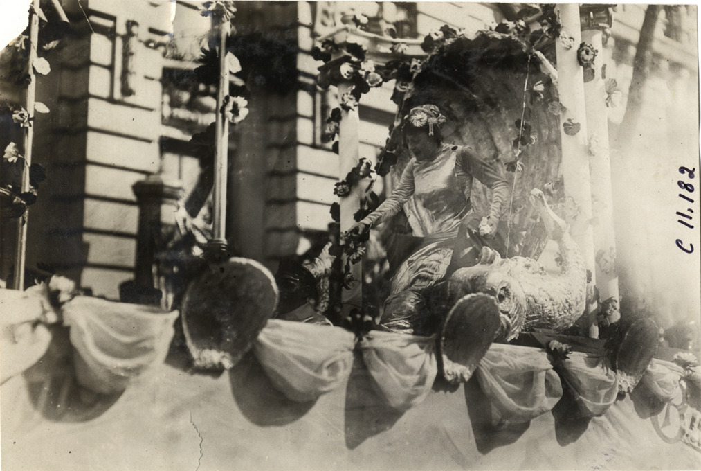 Annette Kellerman riding on Buick float, 1909 New York automobile carnival