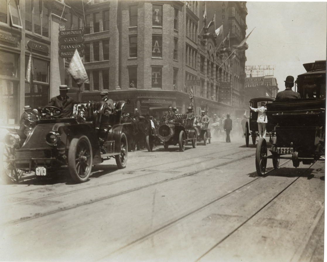 Automobiles in street, 1906 baseball parade, New York