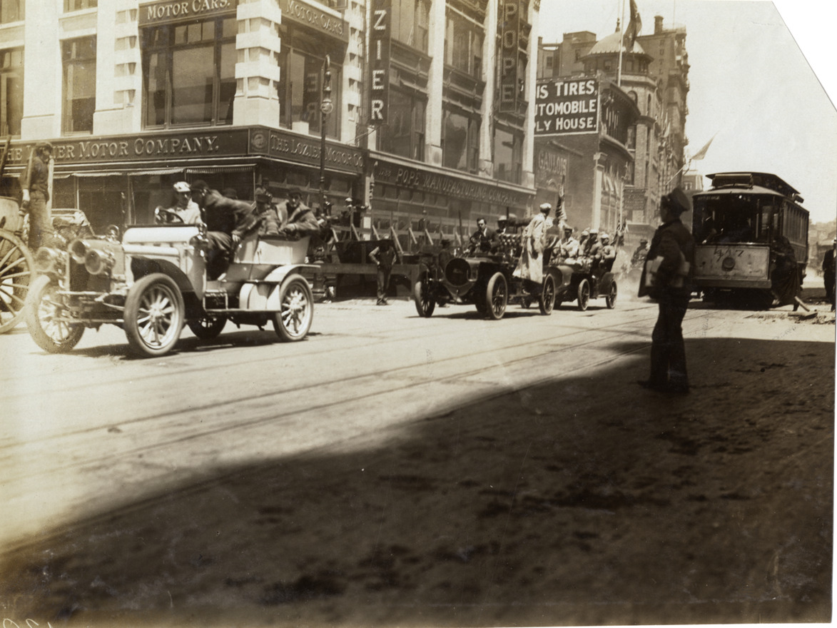 View of cars in street for 1906 baseball parade in New York City honoring the New York Giants. Streetcar in background. Stamped on back: "Photo by F. Ed. Spooner, 1536 B'way, telephone 6536-38th St., New York, N.Y." Handwritten on back: "Parades--New York baseball parade, 1906."
