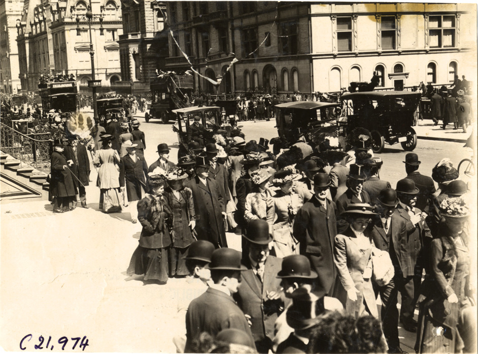 View of men and women walking along Fifth Avenue during 1909 Easter parade in New York City. Automobiles and buses in street. Stamped on back: "Spooner & Wells, Inc., photographers, 1231 Woodward Ave., Detroit, Mich., telephone North 1745." Handwritten on back: "Parades--New York Easter parade, 1909. Along 5th Avenue."