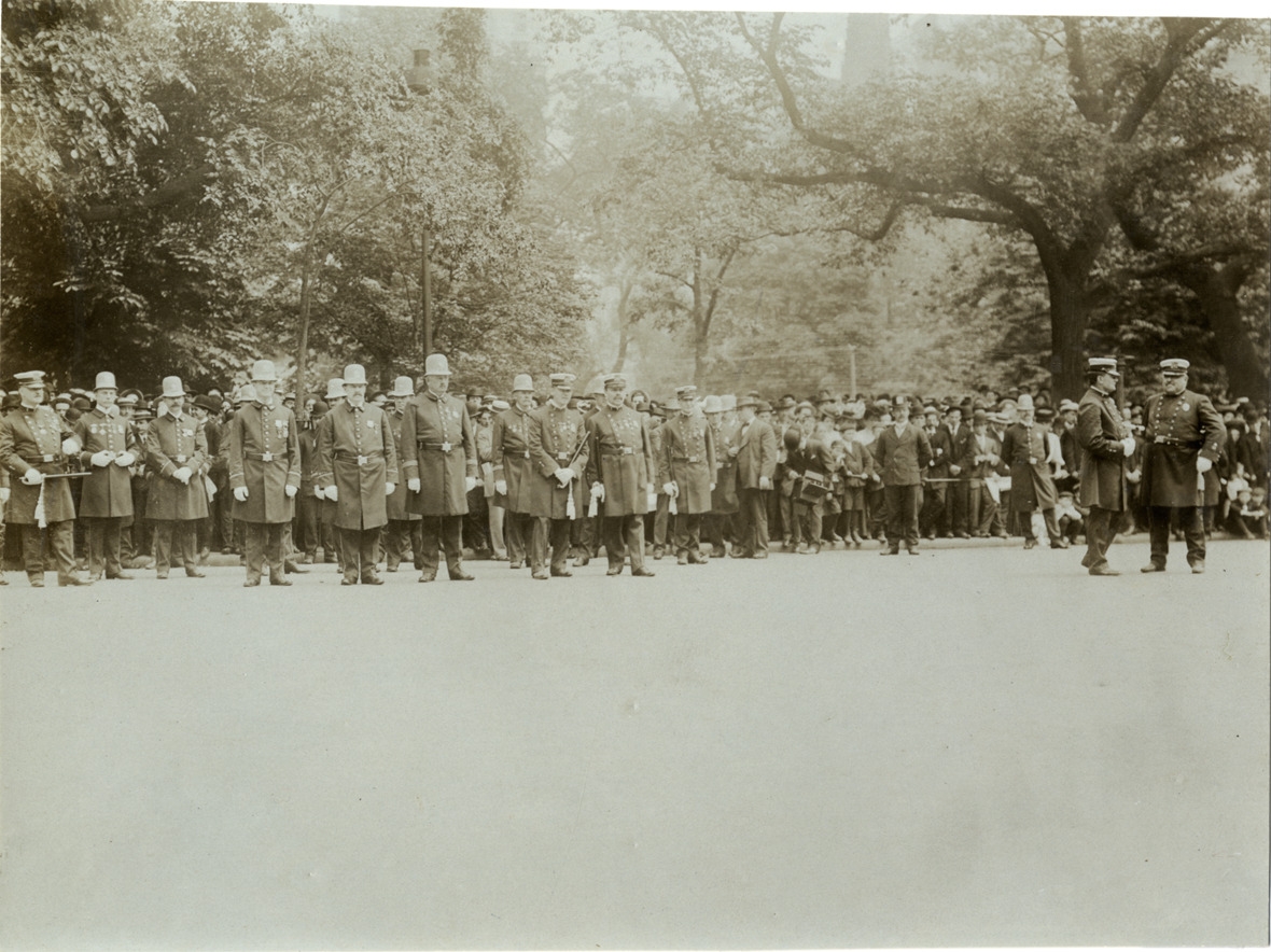 Favorite this☆ Policemen standing in formation, 1906 New York policeman's parade Description: View of police officers standing in formation during 1906 parade honoring New York Police Department. Handwritten on back: "Parades--New York policeman's parade, 1906." Details Resource ID: na010358 Subject: Police--New York (State)--New York New York (N.Y.). Police Dept. Parades--New York (State)--New York Photographic prints Date Issued: 1906-06-02 Format: 1 photographic print ; 6 x 8 in. Member of: National Automotive History Collection Lazarnick Collection Filing Location: Parades--New York policeman's parade, 1906 Rights: Physical rights are retained by DPL. Copyright is retained in accordance with U.S. copyright laws.