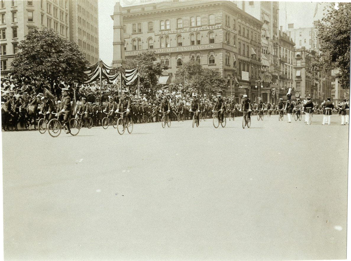 Favorite this☆ Bicycle police, 1906 New York policeman's parade Description: View of bicycle police passing in front of reviewing stand during 1906 parade honoring New York Police Department. Handwritten on back: "Parades--New York policeman's parade, 1906." Details Resource ID: na010363 Subject: Bicycle police--New York (State)--New York Bicycles--New York (State)--New York New York (N.Y.). Police Dept. Parades--New York (State)--New York Photographic prints Date Issued: 1906-06-02 Format: 1 photographic print ; 6 x 8 in. Member of: National Automotive History Collection Lazarnick Collection Filing Location: Parades--New York policeman's parade, 1906 Rights: Physical rights are retained by DPL. Copyright is retained in accordance with U.S. copyright laws.