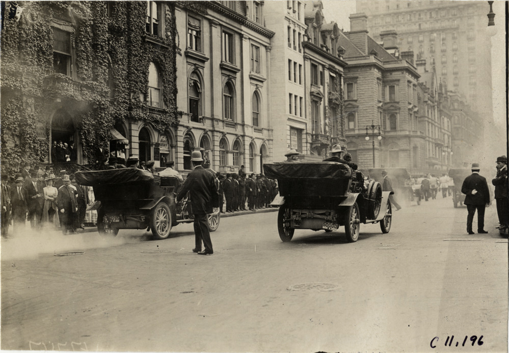 Officials in automobiles, 1909 New York street cleaners parade