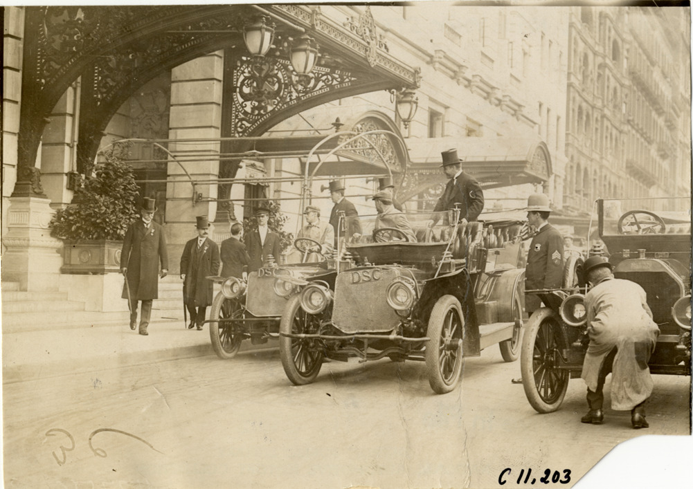 View of unidentified officials approaching parked cars in front of building during 1909 parade honoring New York street cleaners. "DSC" on front of cars in foreground. Stamped on back: "Spooner & Wells, Inc., photographers, telephones 3472-3473 Columbus, 1931 Broadway, New York." Handwritten on back: "Parades--New York street cleaners parade, 1909."
