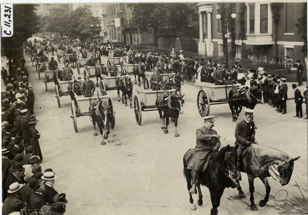 Street cleaners driving horse-drawn carts, 1909 New York street cleaners parade