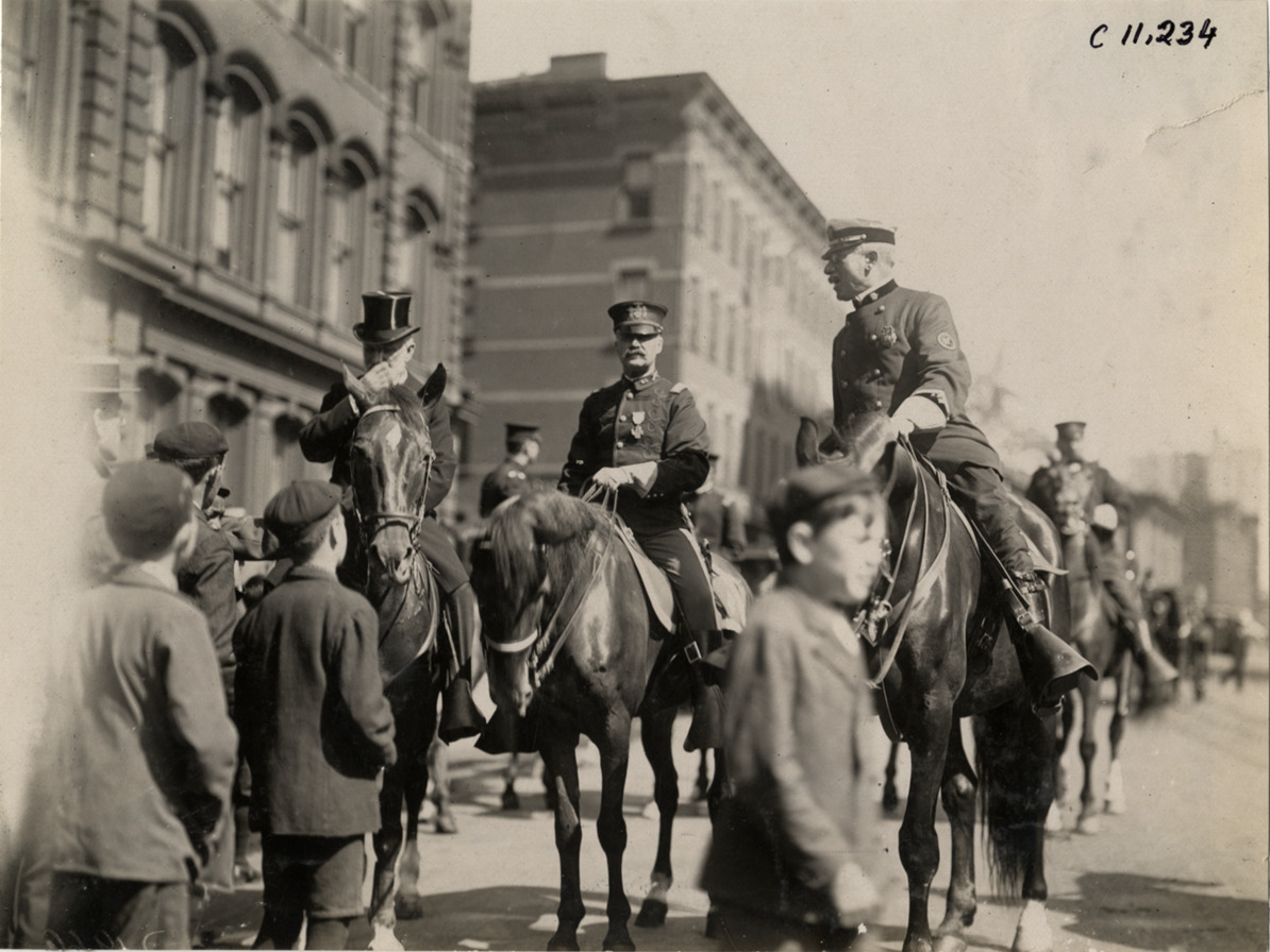 View of three men on horseback, two wearing uniforms, during 1908 reception in New York for returning Olympic athletes from London. Stamped on back: "Spooner & Wells, Inc., photographers, telephones 3472-3473 Columbus, 1931 Broadway, New York." Handwritten on back: "Parades--Olympic athletes reception, 1908. From England."