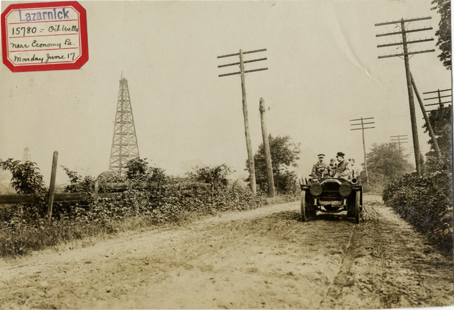 View of motorists in 1907 Peerless car traveling past oil wells near Economy, Pennsylvania. Label on front: "Lazarnick. 15780. Oil wells near Economy, Pa. Monday, June 17." Stamped on back: "Photo by N. Lazarnick, 29 West 42nd Street, New York." Handwritten on back: "Peerless, 1907. Oil wells near Economy, Pa. Monday, June 17."