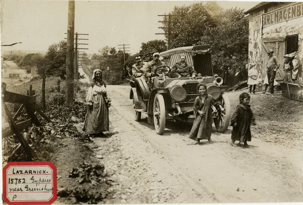 View of motorists in 1907 Peerless car posing with gypsy woman and girls in road near Greensburg, Pennsylvania. Striped caravan in background. Label on front: "Lazarnick. 15782. Gypsies near Greensburg, P[a]." Handwritten on back: "Peerless, 1907."
