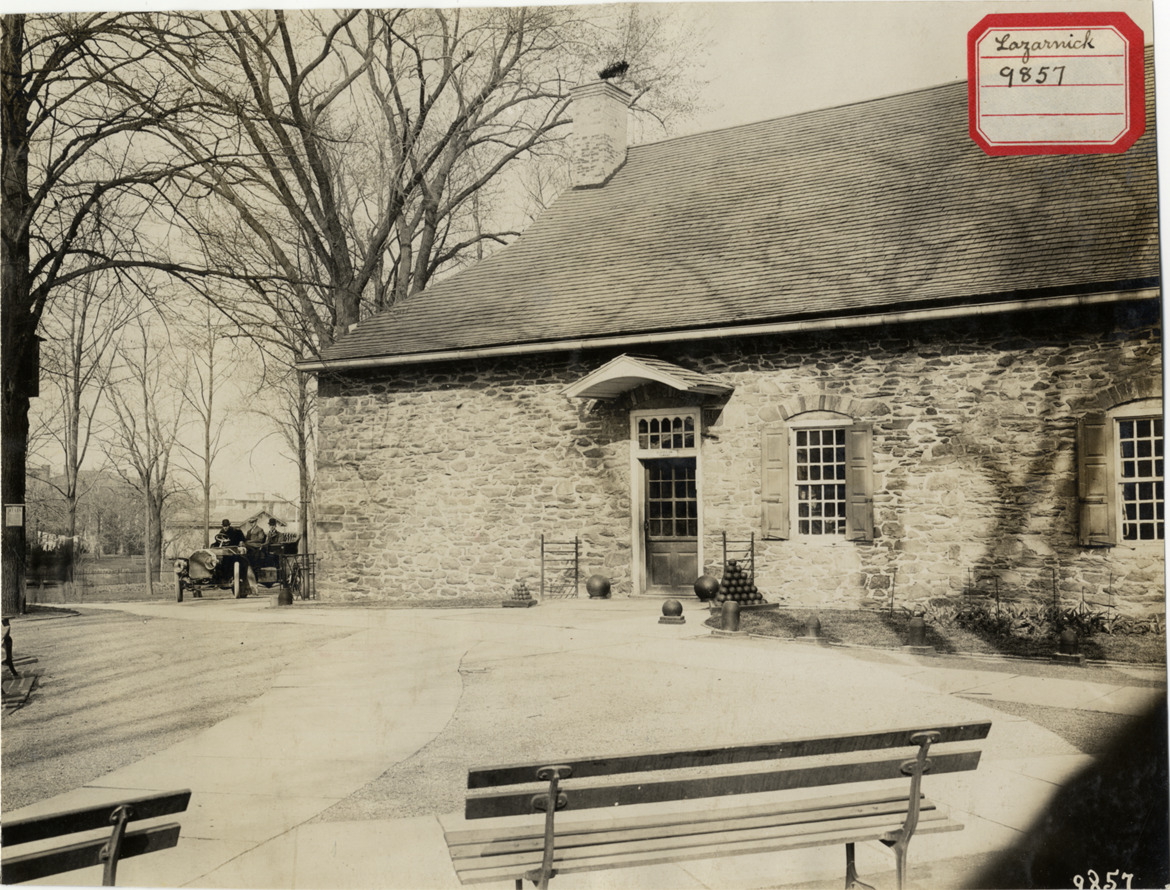 View of motorists in 1907 Peerless car parked next to stone house. Cannonballs displayed in front of doorway; park benches in foreground. Label on front: "Lazarnick. 9857." Stamped on back: "Photo by N. Lazarnick, 29 West 42nd Street, New York." Handwritten on back: "Peerless, 1907."