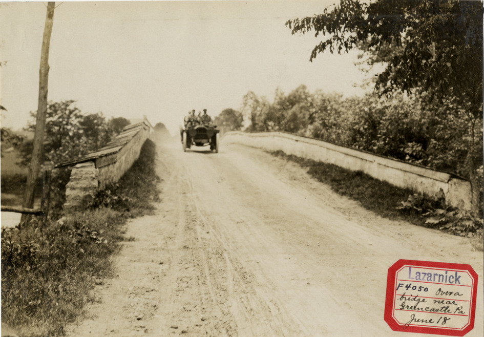 View of motorists in 1907 Peerless car traveling over stone bridge near Greencastle, Pennsylvania. Label on front: "Lazarnick. F4050. Over a bridge near Greencastle, Pa. June 18." Stamped on back: "Photo by N. Lazarnick, 29 West 42nd Street, New York." Handwritten on back: "Peerless, 1907. Over a bridge near Greencastle, Pa., Tuesday, June 18."