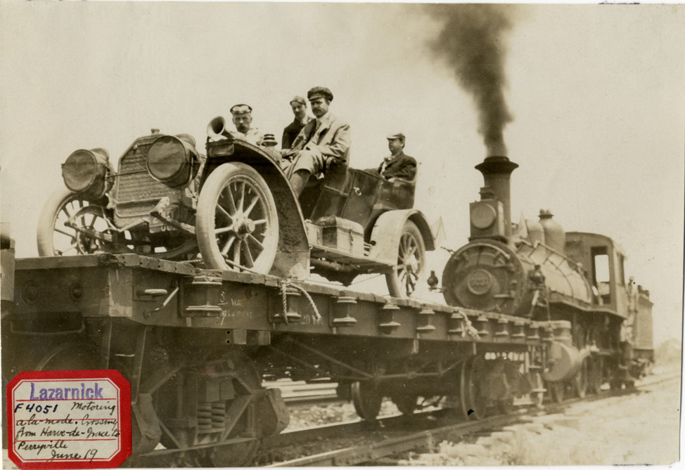 View of motorists in 1907 Peerless car atop railroad flatcar crossing from Havre de Grace to Perryville, Maryland. Locomotive in background. Label on front: "Lazarnick. F4051. Motoring a la mode. Crossing from Harve-de-Grace [sic] to Perryville. June 19." Stamped on back: "Photo by N. Lazarnick, 29 West 42nd Street, New York." Handwritten on back: "Peerless, 1907. Motoring a la mode. Crossing from Havre-de-Grace to Perryville, Md. by R.R. Wednesday, June 19."