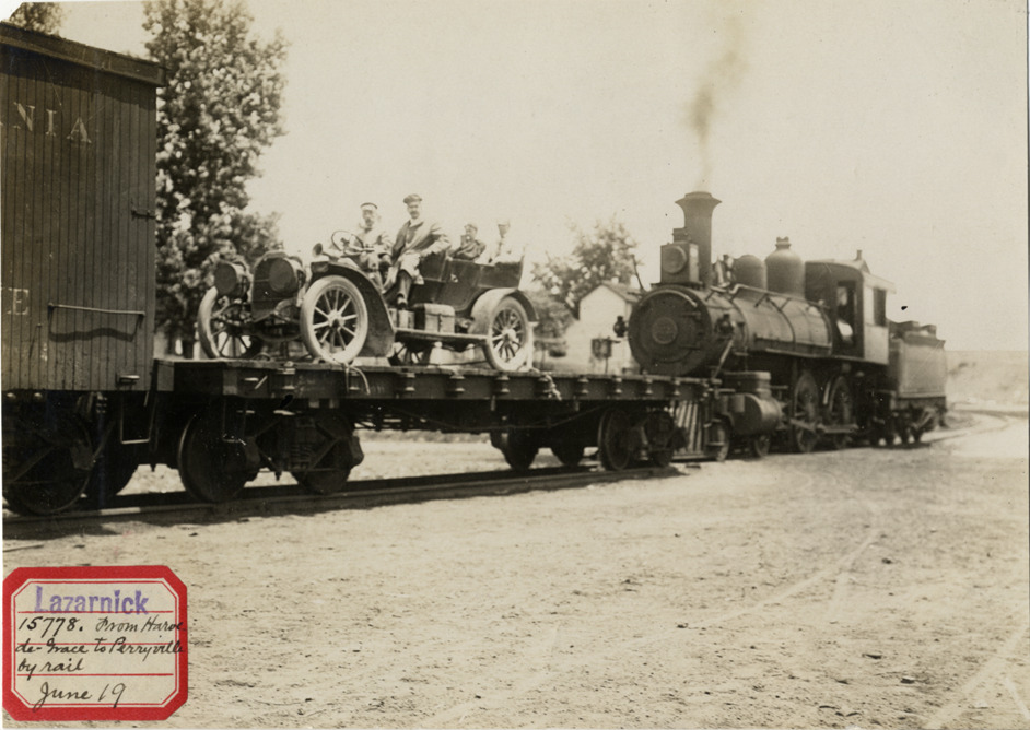View of motorists in 1907 Peerless car atop railroad flatcar crossing from Havre de Grace to Perryville, Maryland. Locomotive in background. Label on front: "Lazarnick. 15778. From Harve-de-Grace [sic] to Perryville by rail. June 19." Stamped on back: "Photo by N. Lazarnick, 29 West 42nd Street, New York." Handwritten on back: "Peerless, 1907. From Havre-de-Grace to Perryville, Md. by rail. Wednesday, June 19."