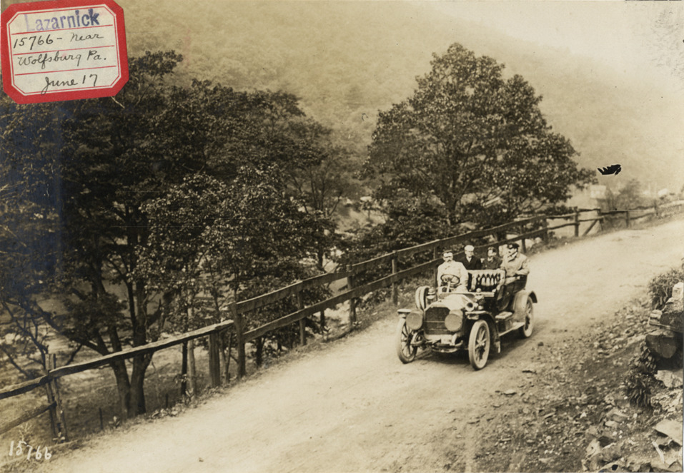 View of motorists in 1907 Peerless car traveling on rural road near Wolfsburg, Pennsylvania. Label on front: "Lazarnick. 15766. Near Wolfsburg, Pa. June 17." Stamped on back: "Photo by N. Lazarnick, 29 West 42nd Street, New York." Handwritten on back: "Peerless, 1907. Near Wolfsburg, Pa. Monday, June 17."