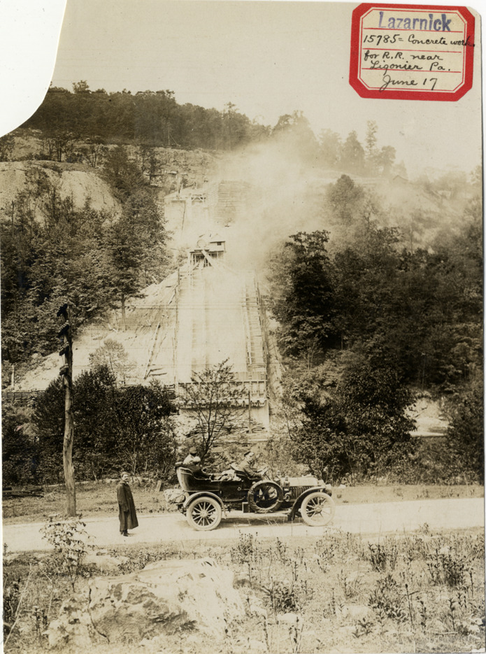 View of motorists in 1907 Peerless car parked in front of stone crusher and railroad concrete works near Ligonier, Pennsylvania. Label on front: "Lazarnick. 15785. Concrete works for R.R. near Ligonier, Pa. June [sic] 17." Stamped on back: "Photo by N. Lazarnick, 29 West 42nd Street, New York." Handwritten on back: "Peerless, 1907. Concrete works for R.[R.] near Ligonier, Pa. Monday, June [sic] 17." Date on photograph is incorrect, should be July.