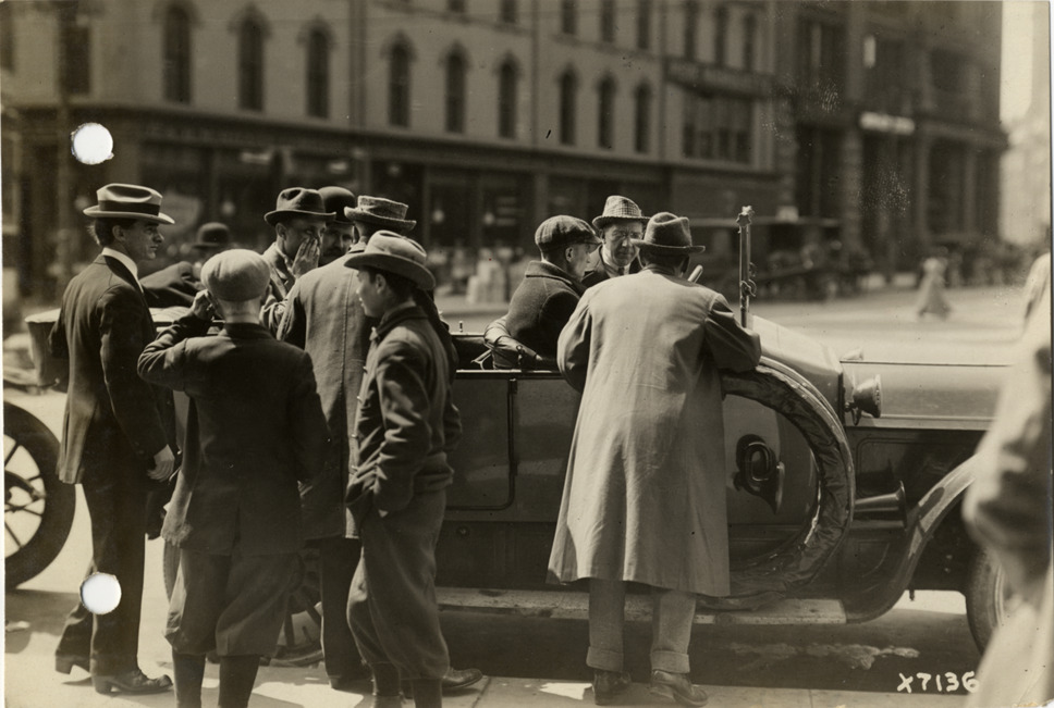 View of Scottish music hall comedian Harry Lauder in car. Group of men and boys stand around automobile. Stamped on back: "Spooner & Wells, Inc., photographers, 1231 Woodward Ave., Detroit, Mich., telephone North 1745." Handwritten on back: "Personalities. Harry Lauder (comedian)."