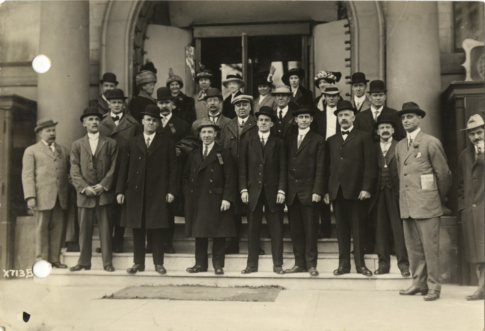 View of Scottish music hall comedian Harry Lauder posing with group of unidentified men on building steps. Stamped on back: "Spooner & Wells, Inc., photographers, 1231 Woodward Ave., Detroit, Mich., telephone North 1745." Handwritten on back: "Personalities. Harry Lauder (comedian)."