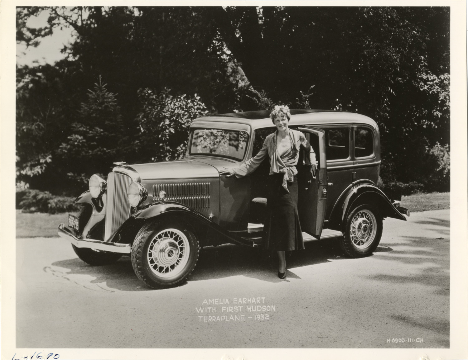 View of aviator Amelia Earhart posing with 1932 Essex Terraplane car. Printed on front: "Amelia Earhart with first Hudson Terraplane, 1932." Handwritten on back: "Personalities. Amelia Earhart, 1932 Terraplane."