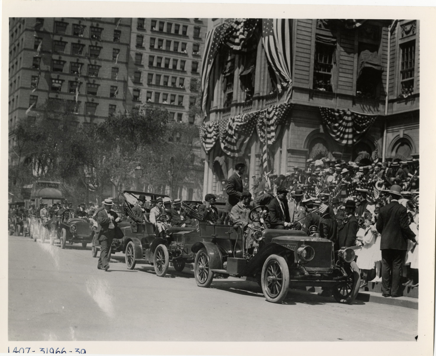 Athletes exiting automobiles in front of City Hall, 1908 reception for returning Olympic athletes, New York