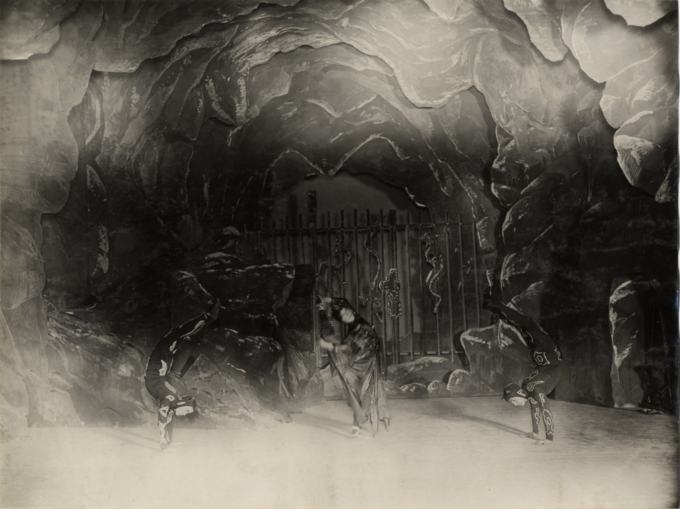 Favorite this☆ Scene from unidentified play Description: View of three dancers, two men and a woman, on stage during scene of unidentified play. Men wear devil costumes and perform handstands. Scenery depicts hell with underground cave and gates. Handwritten on back: "Plays, 1908." Details Resource ID: na010561 Subject: Theater Costume Dancers Theaters--Stage-setting and scenery Photographic prints Date Issued: 1908 Format: 1 photographic print ; 7 x 9.25 in. Member of: National Automotive History Collection Lazarnick Collection Filing Location: Plays Rights: Physical rights are retained by DPL. Copyright is retained in accordance with U.S. copyright laws.