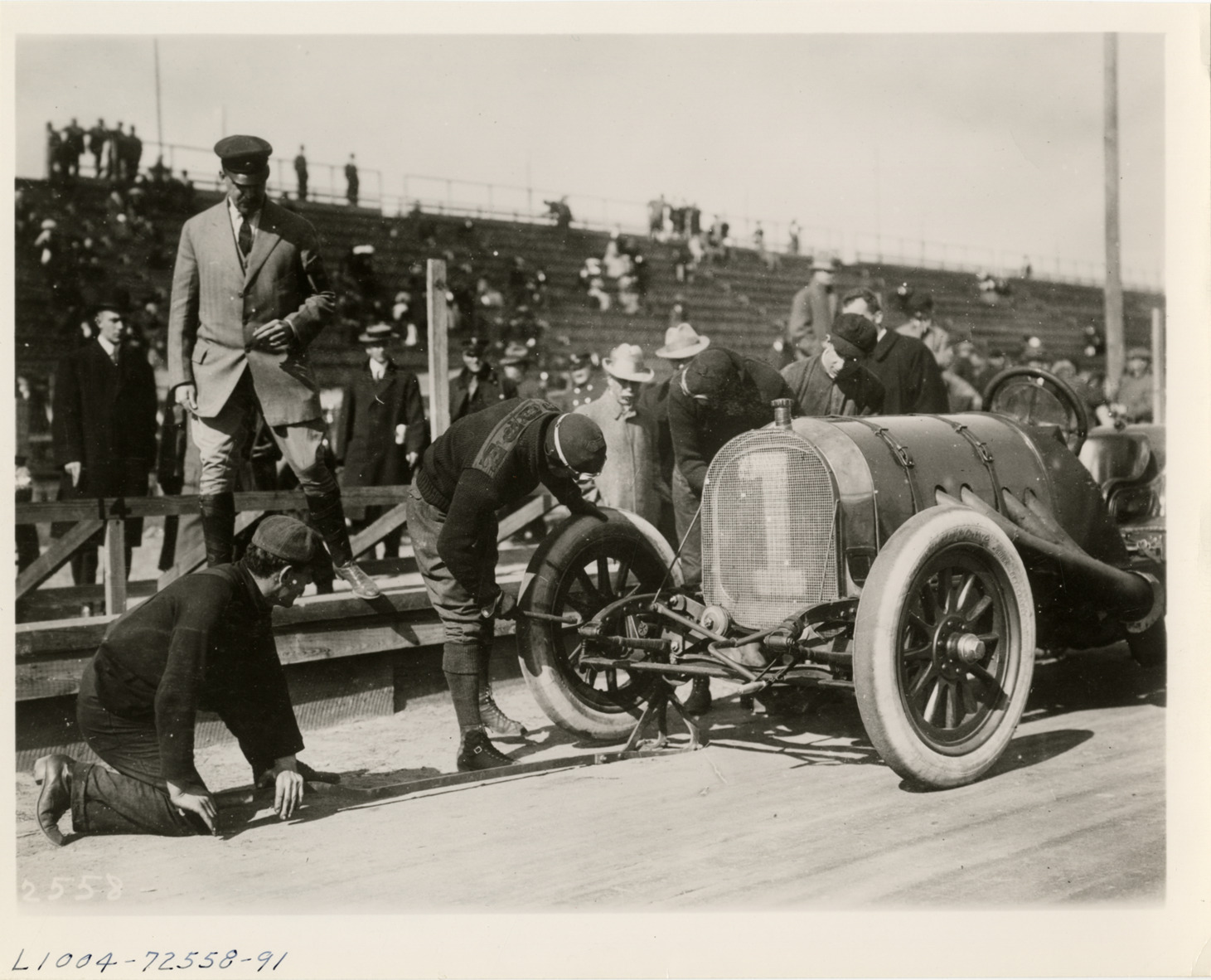 Favorite this☆ Driver changing tire of Pope Hummer racecar Description: View of driver changing tire of Pope Hummer racecar no. 1 on side of racetrack. Grandstand in background. Handwritten on back: "Pope-Hartford. Changing a tire on the Pope 'Hummer.'" Details Resource ID: na010577 Subject: Automobiles, Racing Pope Manufacturing Company Automobiles, Racing--Tires--Maintenance and repair Photographic prints Date Issued: Unknown year Format: 1 photographic print ; 8 x 10 in. Member of: National Automotive History Collection Lazarnick Collection Filing Location: Pope-Hartford Rights: Physical rights are retained by DPL. Copyright is retained in accordance with U.S. copyright laws.
