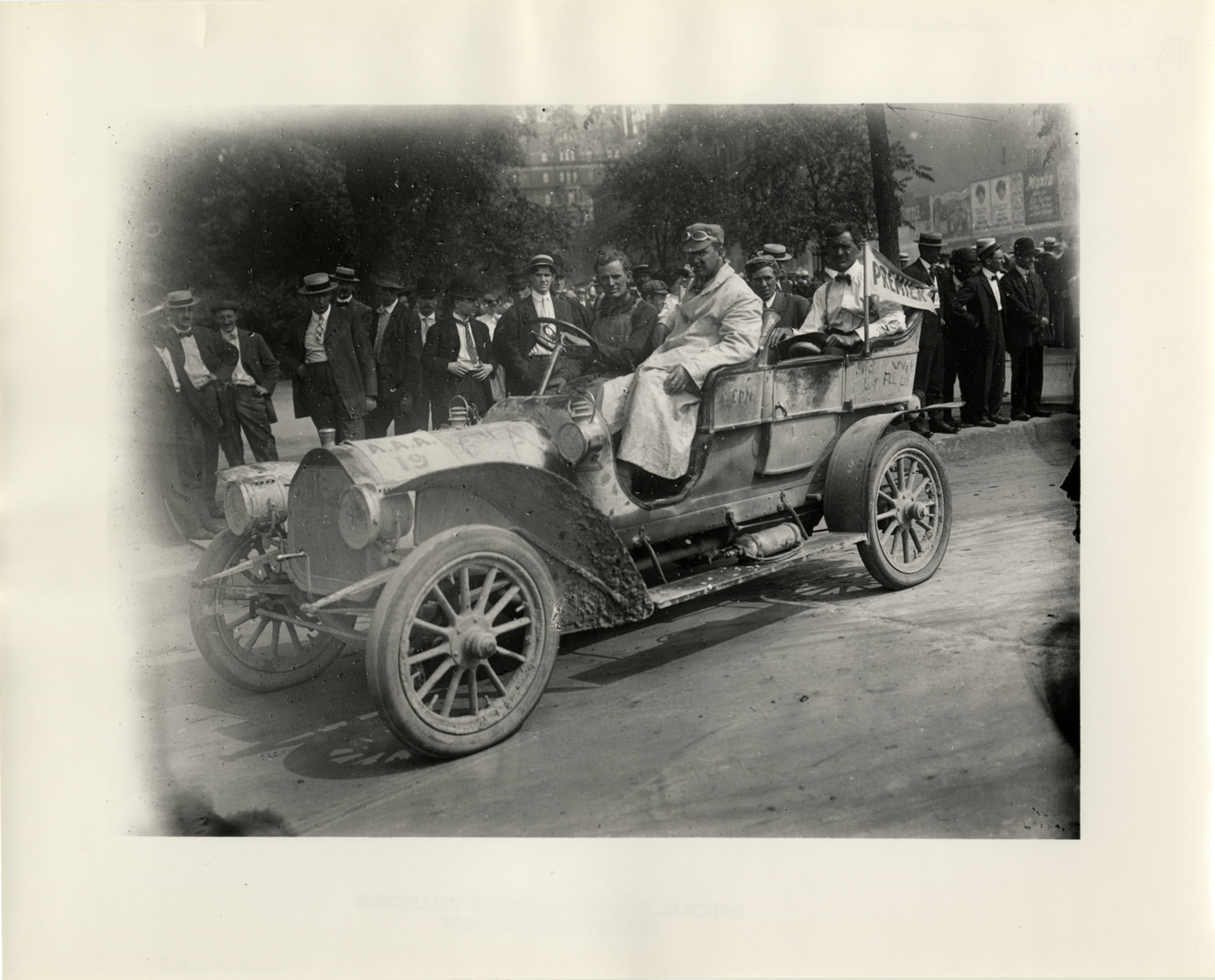View of motorists in Premier car. "Premier" flag and "A.A.A. 19" banner displayed on car; spectators stand on sidewalk. Handwritten on back: "Premier, c.1908."