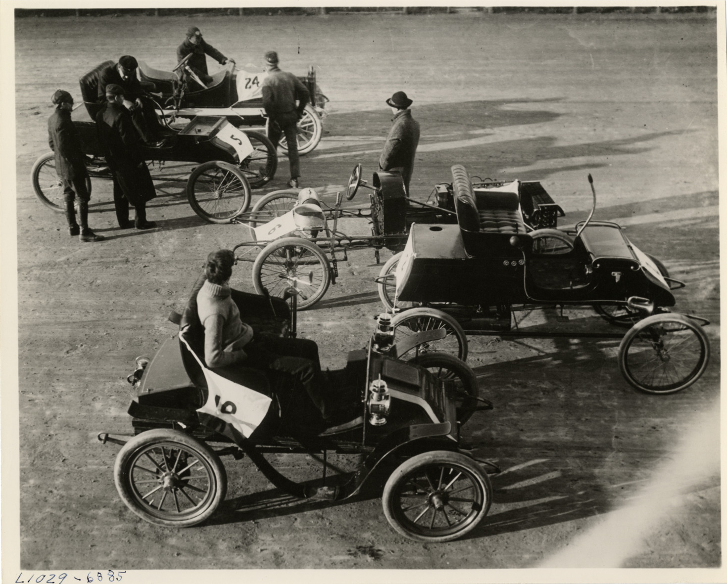 View of men with racecars at Aquidneck track before a race in Newport, Rhode Island. Typed on back: "Probably an automobile race at Acquidneck Track, Newport, Rhode Island, August 30, 1901. Car no. 10 foreground is a 2-cylinder, gasoline Autocar, 1901, built by the Autocar Co., Ardmore, Pa. Cars marked nos. 2 and 5 are Stanley Steam cars. Car no. 6 is a 4-cylinder gasoline car stripped beyond recognition. Car no. 24 is a gasoline car which cannot be identified." Handwritten on back: "Race courses."